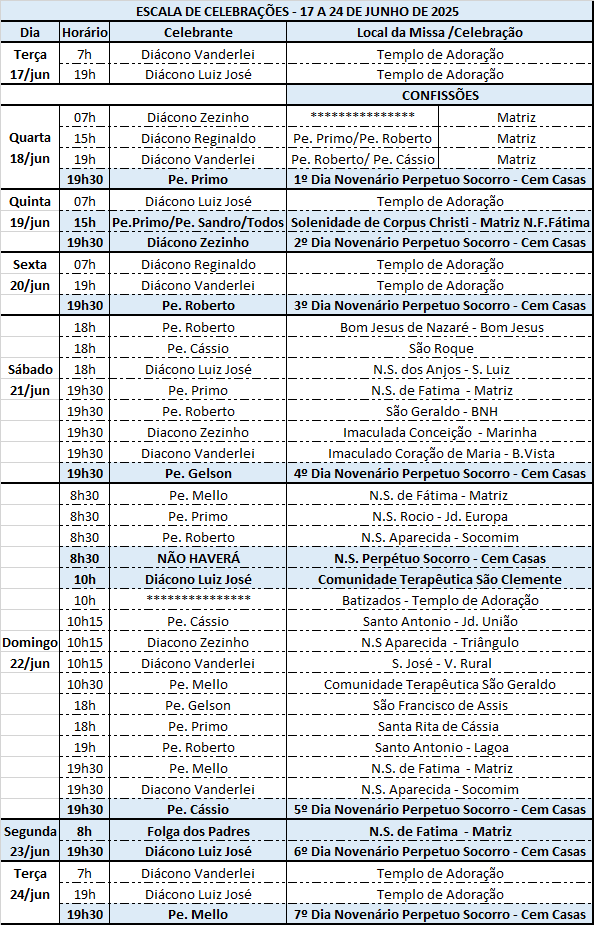 📌 Atenção Ă programação da Solenidade de Corpus Christi e do Novenário de Nossa Senhora do PerpĂ©tuo Socorro, padroeira do municĂpio. Confira abaixo a escala dos padres.