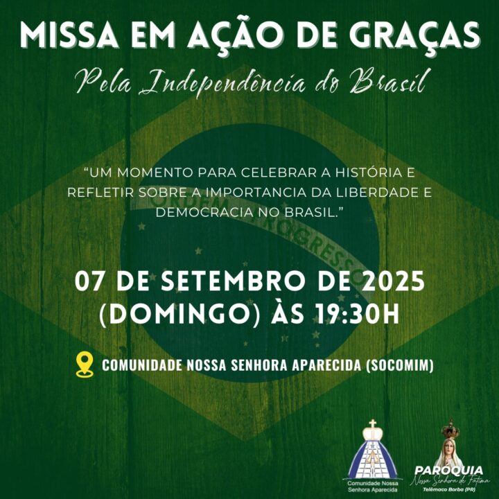 07 de setembro, celebraremos juntos a Missa em Ação de Graças pela Independência do Brasil. A Santa Missa será presidida pelo Padre Gelson e contará...