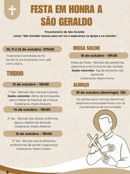 Em comemoração ao tricentenário de São Geraldo, nossa comunidade celebra com alegria a Festa em Honra ao Padroeiro, com o lema:“São Geraldo nasceu para ser...