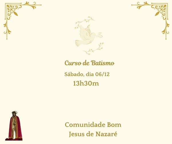 Haverá curso de Batismo neste sábado, dia 06/12 em nossa comunidade, a partir das 13h30m.As inscrições podem ser feitas no local.Trazer o RG e Bíblia.Serão...