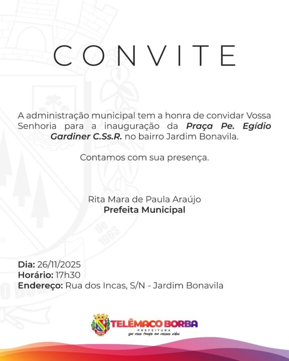 A administração municipal convida para a inauguração da Praça Pe. Egídio Gardiner C.Ss.R., no bairro Jardim Bonavila. A cerimônia acontece no dia 26 de novembro,...