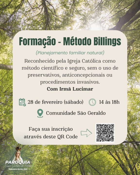 A Paróquia convida para a Formação sobre o Método Billings, um método natural de planejamento familiar, reconhecido pela Igreja Católica como científico e seguro, sem...