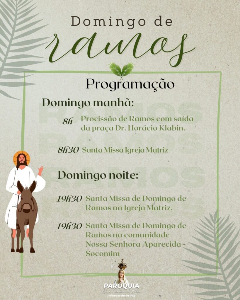 A Paróquia convida toda a comunidade para celebrar o Domingo de Ramos, início da Semana Santa, momento em que recordamos a entrada de Jesus em Jerusalém.