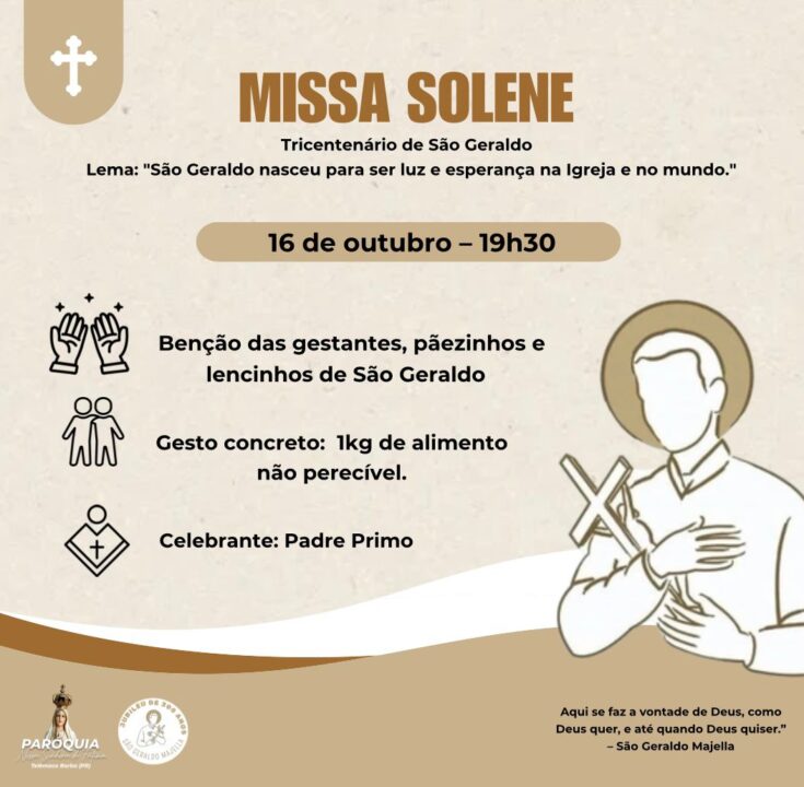 No dia 16 de outubro, às 19h30, acontece a Missa Solene da Festa, com a bênção das gestantes, pãezinhos e lenços de São Geraldo.