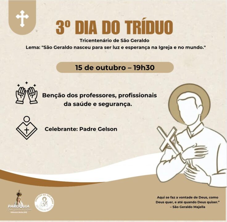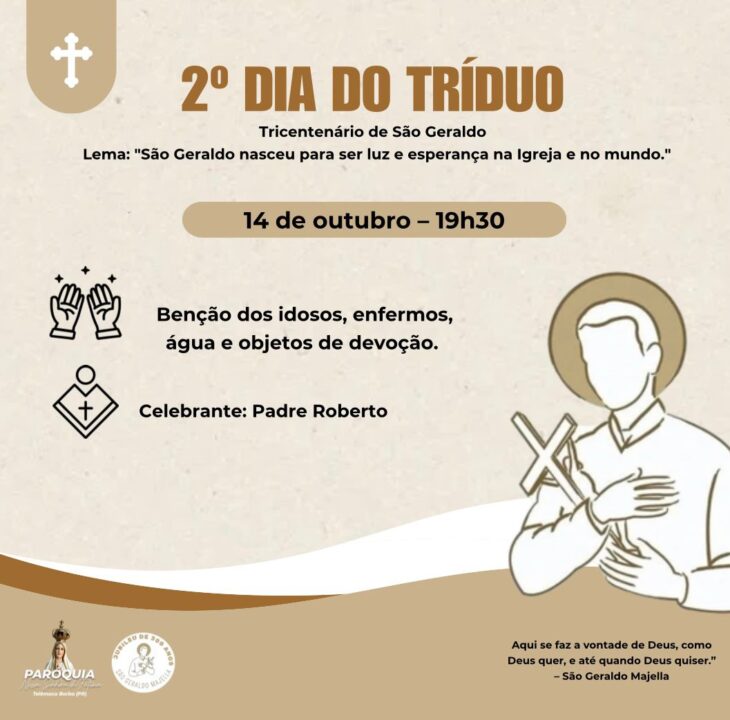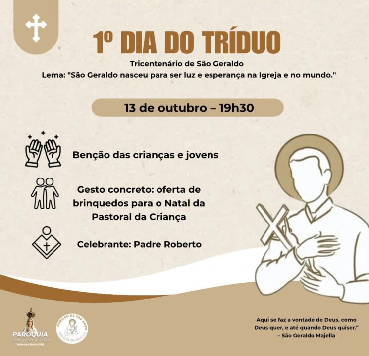 O Tríduo acontecerá de 13 a 15 de outubro, sempre às 19h30, com momentos de oração, bênçãos especiais e gestos concretos de solidariedade: