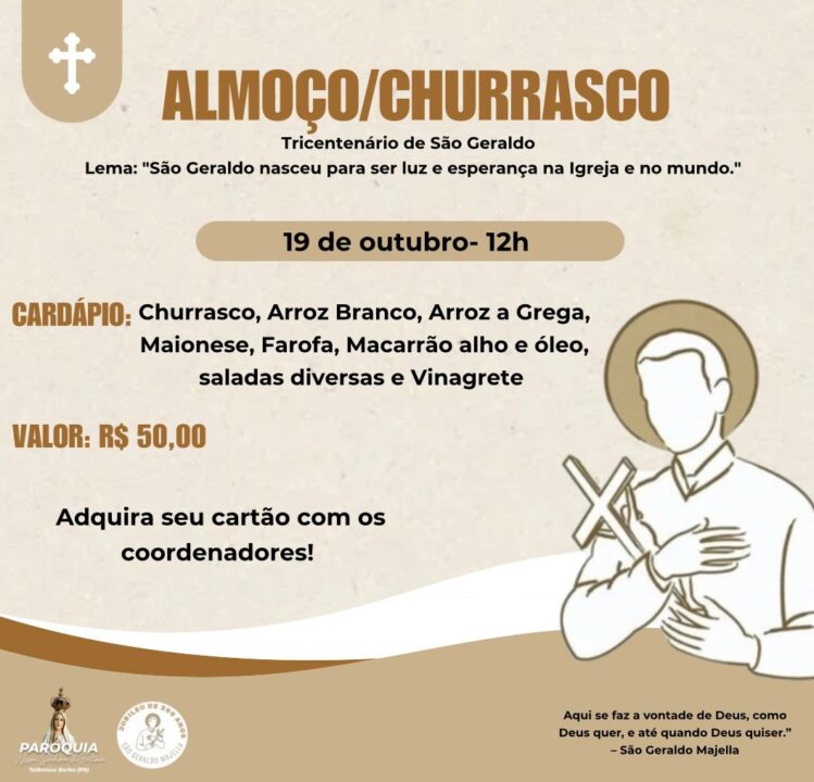 Encerrando as celebrações, no dia 19 de outubro (domingo), será realizado o Almoço Festivo, às 12h.